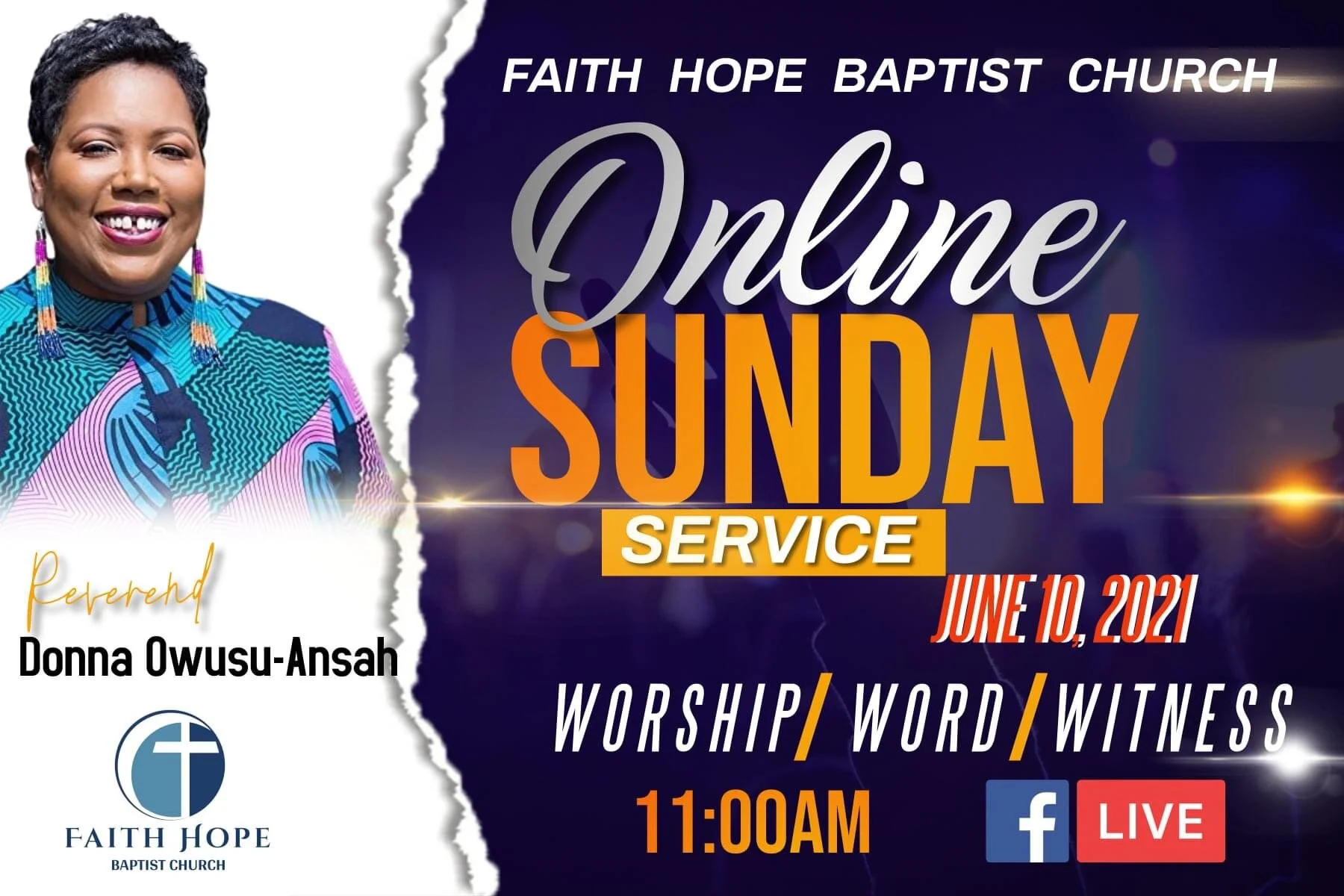 Sunday Morning Worship-Faith Hope Baptist Church Sunday, June 13, 2021 11:00 AM 12:30 PM Google Calendar ICS Join Rev. Donna via LiveStream on Facebook and YouTube on Sunday, June 13, 2021 at 11:00am as she preaches the morning message at Faith Hope Baptist Church, New Brunswick, NJ.